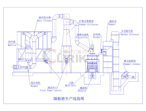 碳酸鈣超細(xì)磨粉機(jī)的設(shè)備組成全套配置包括錘式破碎機(jī)、斗式提升機(jī)、儲(chǔ)料倉(cāng)、震動(dòng)給料機(jī)、微粉磨主機(jī)、變頻分級(jí)機(jī)、雙聯(lián)旋風(fēng)集粉器、脈沖除塵系統(tǒng)、高壓風(fēng)機(jī)、空氣壓縮機(jī)、電器控制系統(tǒng)。